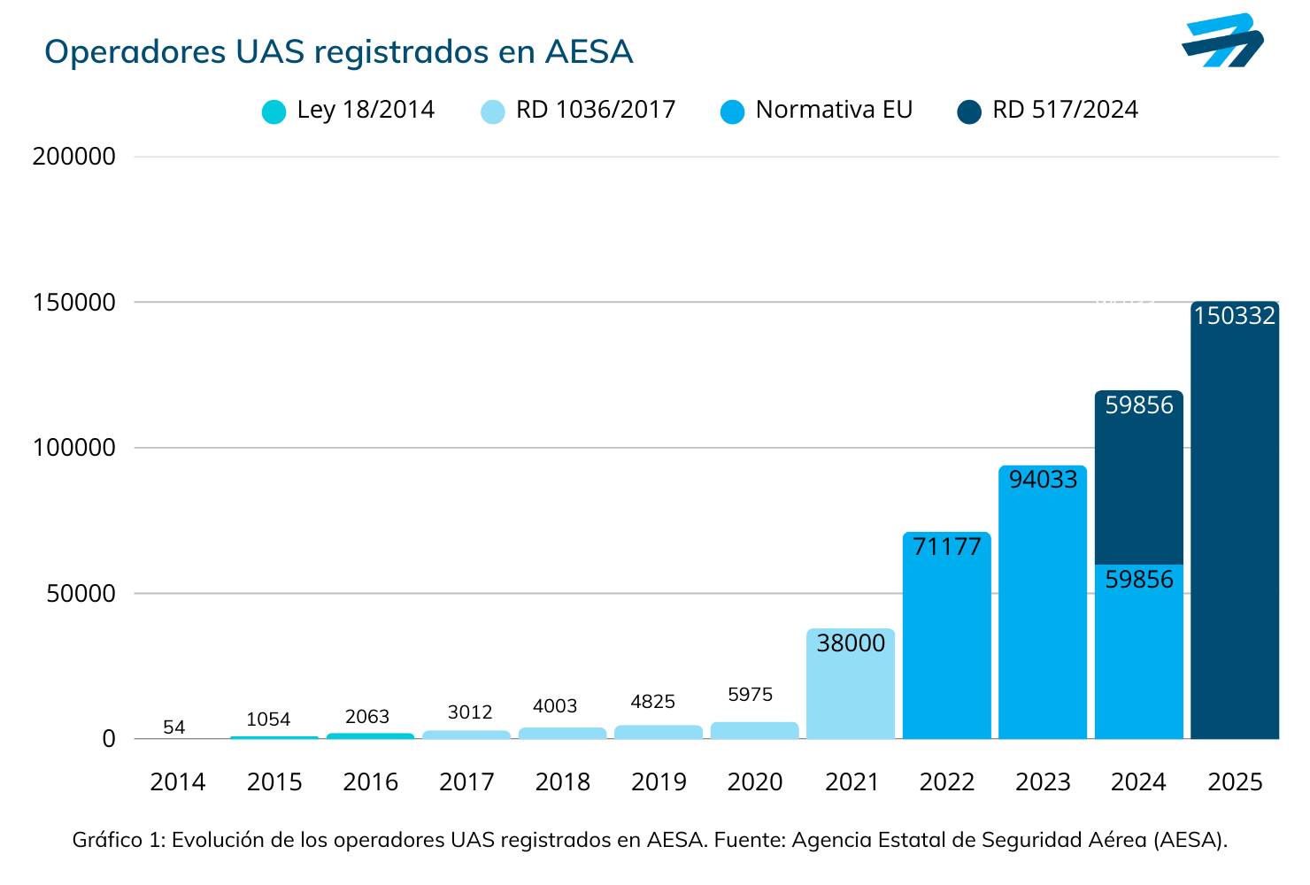 España ha alcanzado en 2025 un nuevo hito en el desarrollo del sector de los sistemas de aeronaves no tripuladas (UAS), al superar los 150.000 operadores registrados en la Agencia Estatal de Seguridad Aérea (AESA). A cierre del año, se han contabilizado 150.332 operadores inscritos, lo que supone un incremento del 26% respecto al año anterior. Este hecho refleja el crecimiento sostenido y la consolidación del uso de los drones en nuestro país.